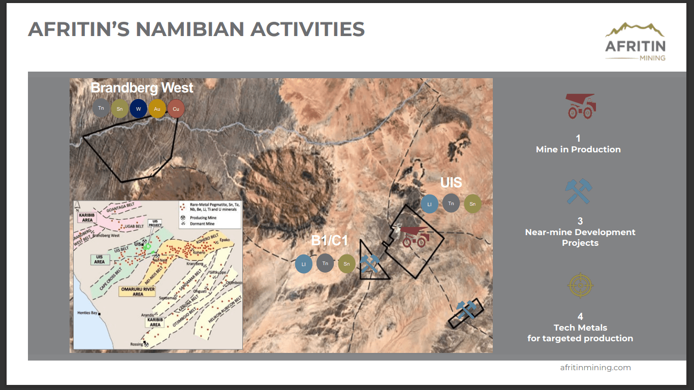 AfriTin Mining is a Namibia-based, low-cost, high-margin tin producer with lithium and tantalum potential. The company is at the forefront of the development of a new tech and green metals province. The company is listed on the London Stock Exchange (AIM: ATM) and the OTC Markets (OTC: AFTTF).