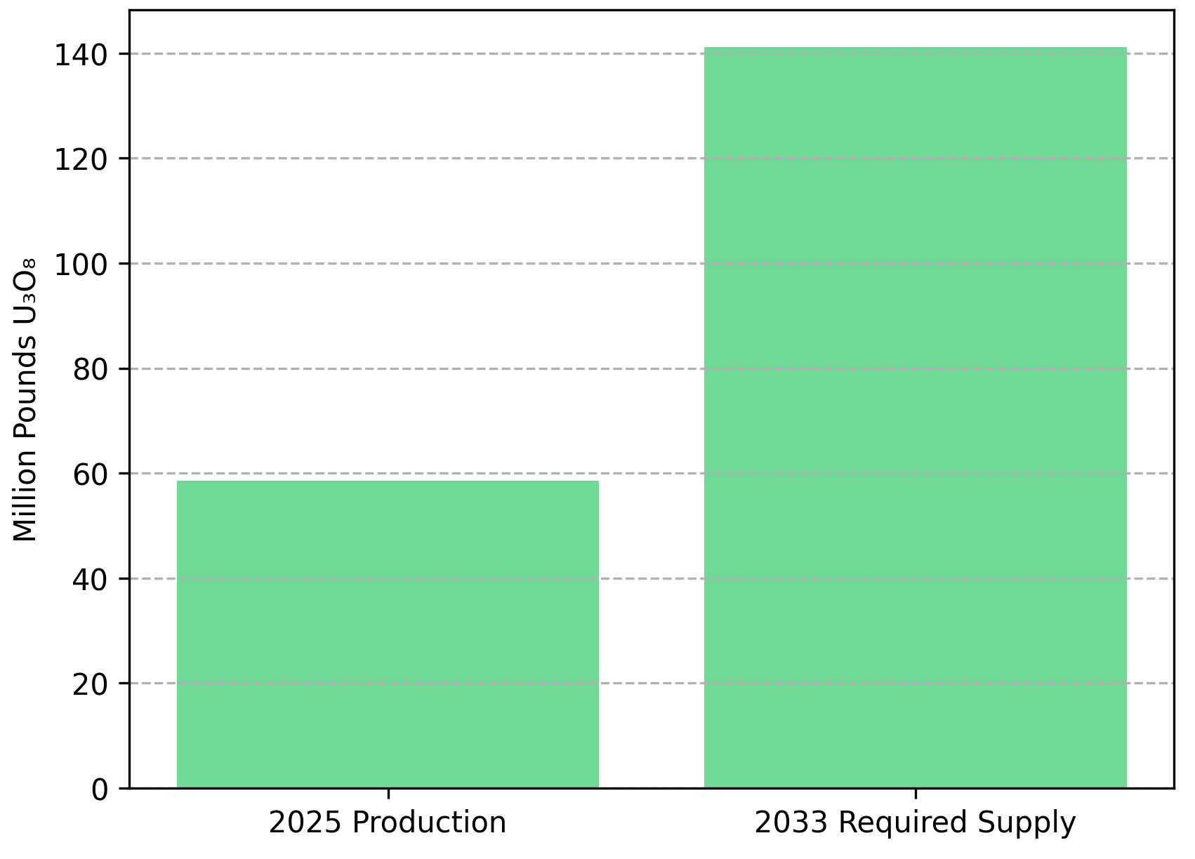 World uranium production in 2025 is approximately 58.5 million pounds of U₃O₈, with supply needing to reach roughly 141.2 million pounds by 2033 - a 2.5-fold increase - to balance projected demand. No single mine or jurisdiction can absorb that shortfall.