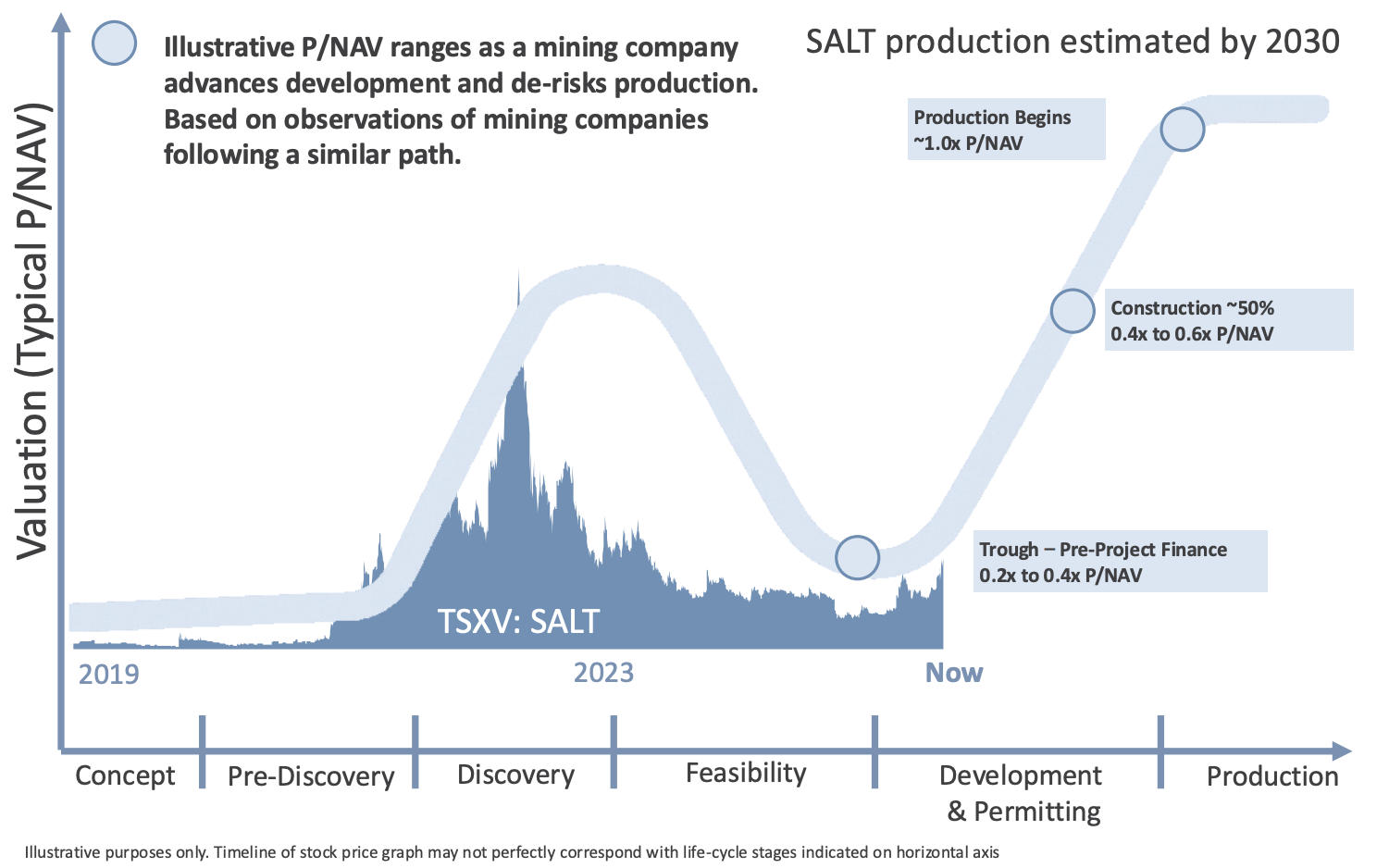 The commencement of site preparation places Atlas Salt at the transition point between the feasibility and development phases. According to the Lassonde Curve framework, projects at this pre-project finance stage typically trade in a 0.2x to 0.4x price-to-net asset value (P/NAV) trough, before re-rating toward 0.4x to 0.6x P/NAV at the construction midpoint and approximately 1.0x P/NAV at first production.