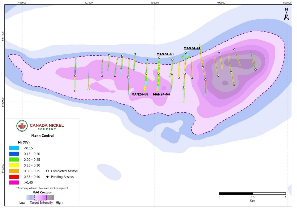 Additional targets tested in 2024 included Mann Central and Mann North. Multiple drillholes at Mann Central intersected broad zones of >0.2% nickel mineralization, while several holes across all targets returned anomalous platinum group metal values associated with pyroxenite units.