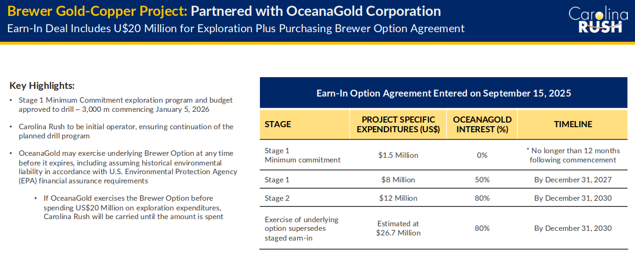 Under the terms of the earn-in, OceanaGold must spend US$8 million over the first two years to earn 50%, with an option to invest an additional US$12 million over three subsequent years to reach 80%. If OceanaGold elects to exercise the underlying option to purchase the property from the US government (held under option by Carolina Rush), the acquisition price is estimated at US$27 million. OceanaGold would be responsible for 100% of that cost to secure its 80% interest, leaving Carolina Rush with a free-carried 20% in a potentially significant asset.