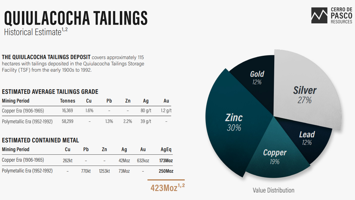 - Cerro de Pasco Resources is advancing the reprocessing of the Quiulacocha Tailings Project in Peru, which contains an estimated 423 million ounces silver equivalent of already-extracted minerals ready for reprocessing.