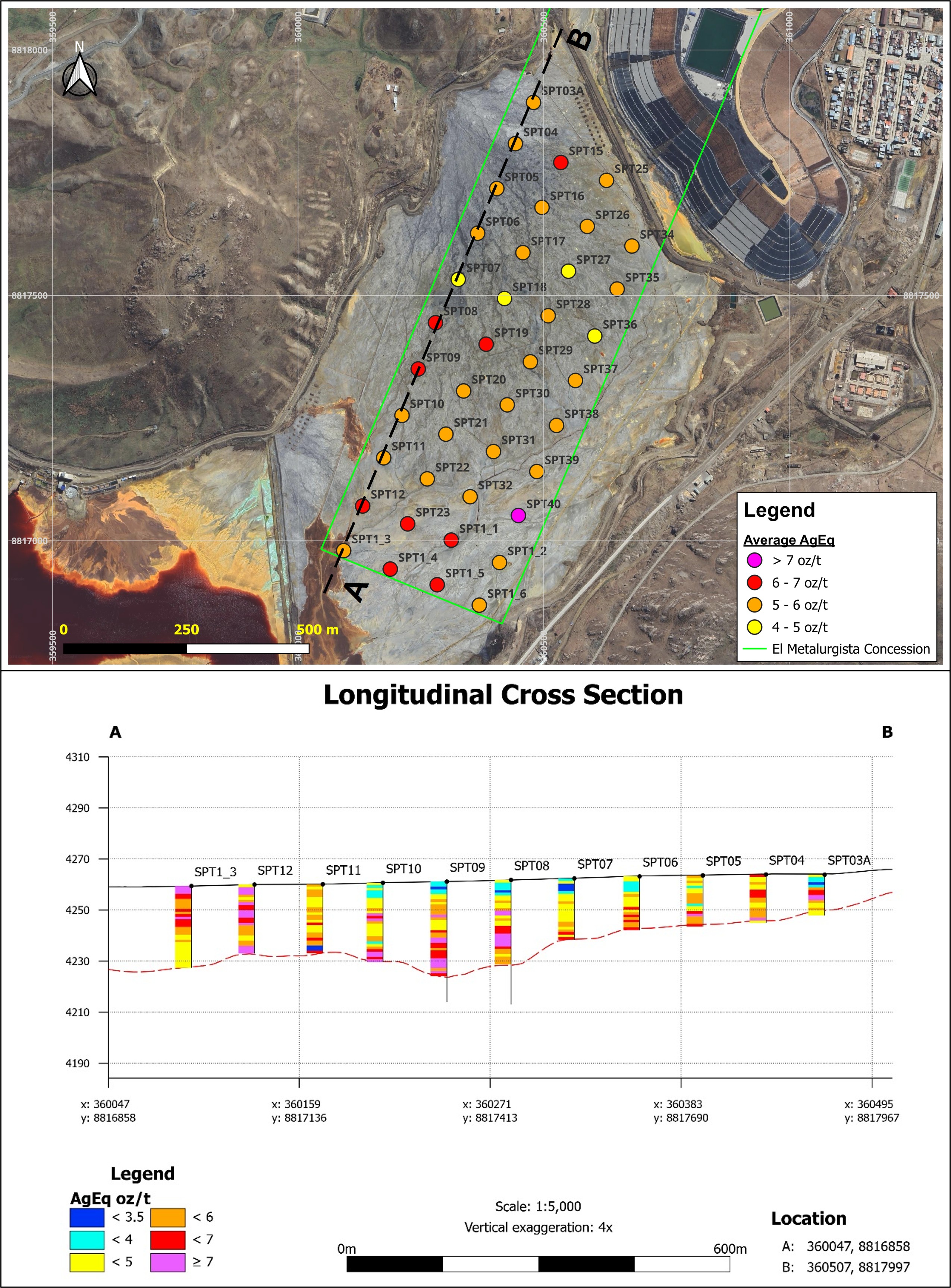 The Quiulacocha Tailings Storage Facility covers approximately 115 hectares with tailings deposited from the early 1900s to 1992. Based on historical metallurgical balances, the tailings are estimated to contain an impressive 423 million ounces of silver equivalent, with a breakdown that includes silver, zinc, lead, copper and gold ounces. The resources were derived from two main mining periods: the Copper Era (1906-1965), which processed high-grade copper-silver-gold ore, and the Polymetallic Era (1952-1992), which focused on zinc-lead-silver ore.