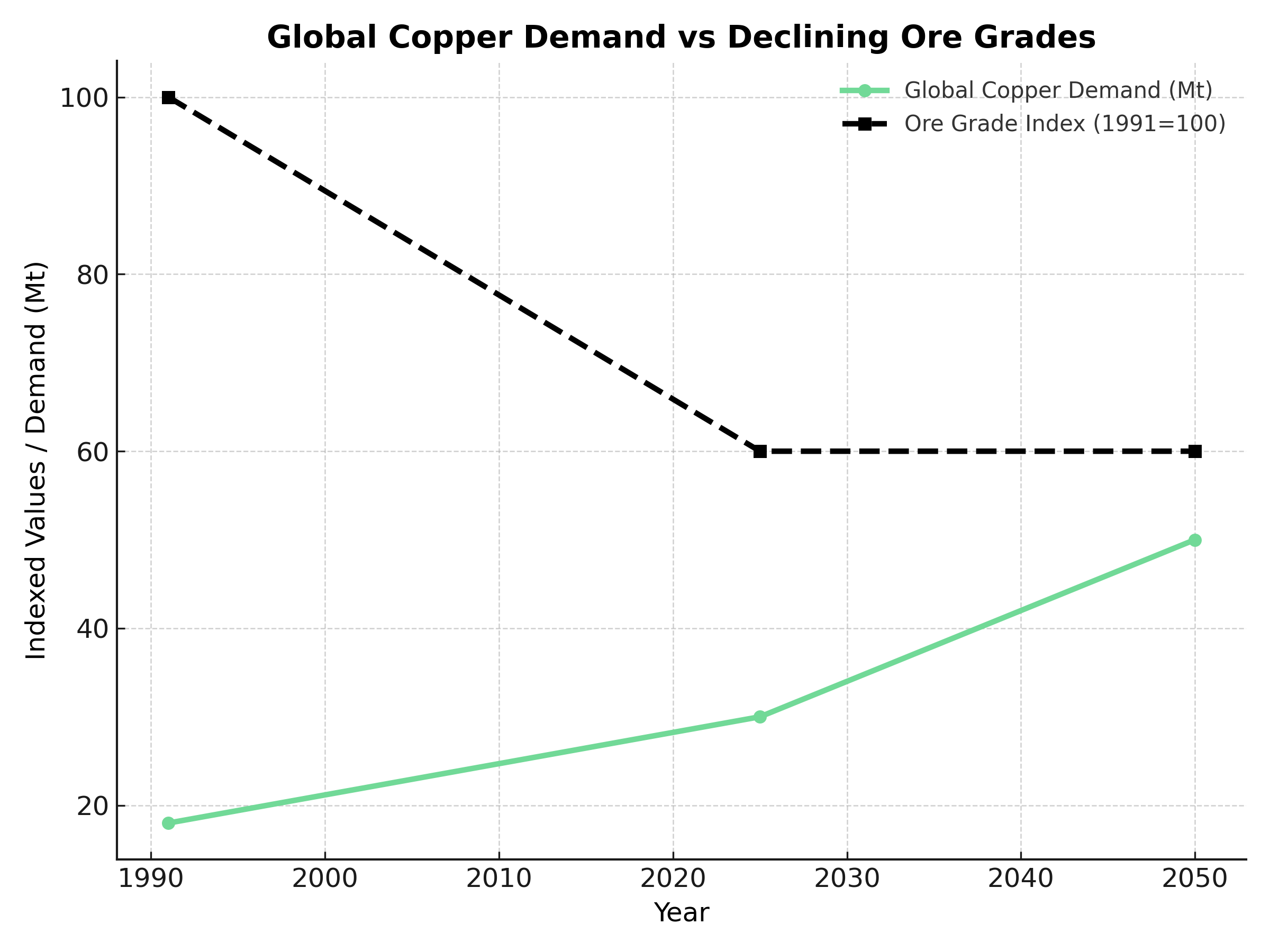 - Global copper demand is set to surge 70% to over 50 million tonnes by 2050, while supply faces structural constraints from declining ore grades (40% decline since 1991) and extended development timelines averaging 17 years from discovery to production.