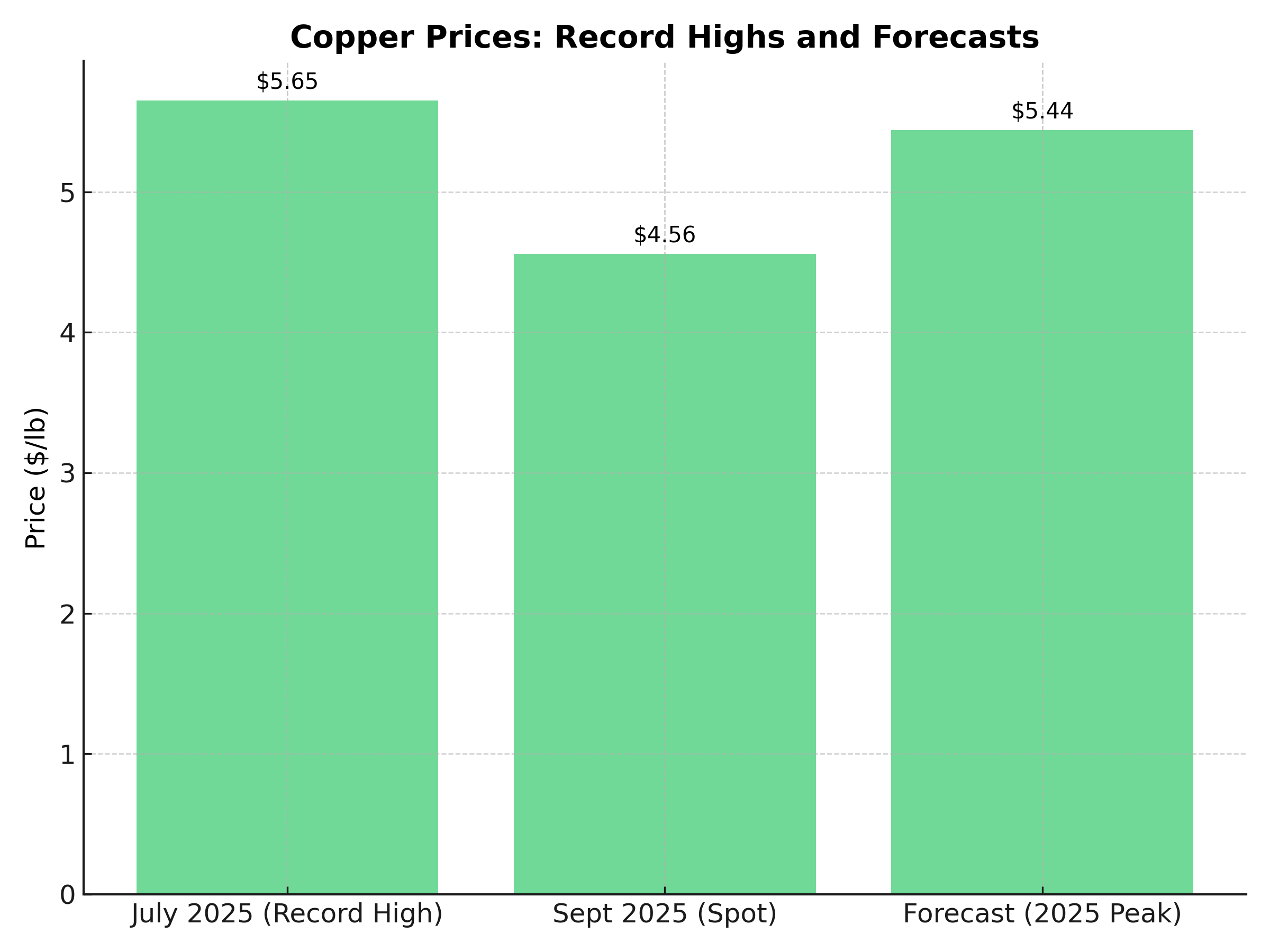 - Copper hit an all-time high of $5.65/lb in July 2025 amid tariff threats and supply concerns, with major trading houses predicting potential $12,000/tonne levels driven by structural deficits and AI/data center demand.