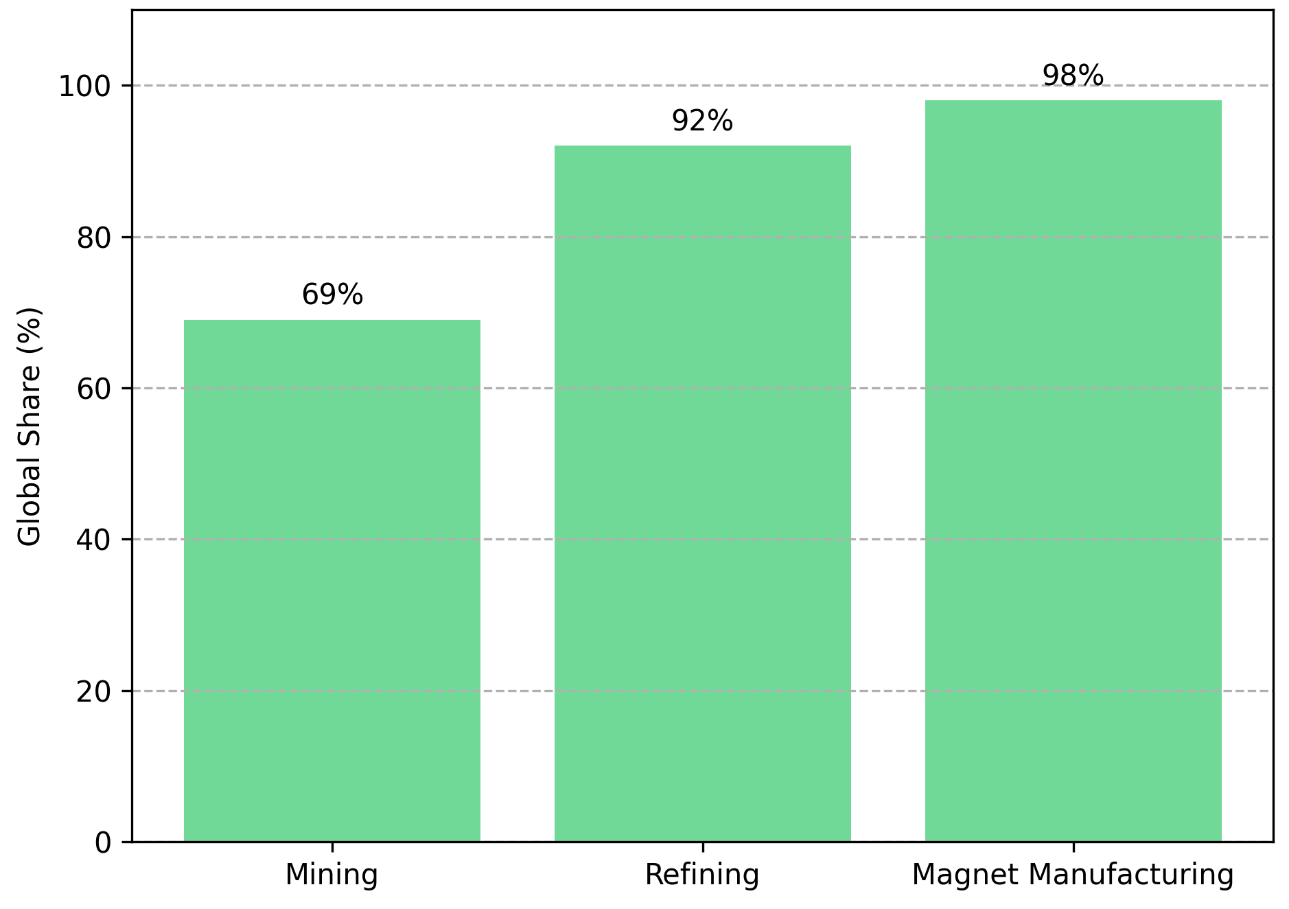 Monetary tailwinds alone do not explain the repricing underway in critical minerals. China's dominant position across the rare earth value chain has transformed these materials from commodity inputs into instruments of geopolitical leverage. With 69% of global rare earth mining, 92% of refining capacity, and 98% of permanent magnet manufacturing, China's October 2025 expansion of export scrutiny has compounded supply concerns that were already acute.