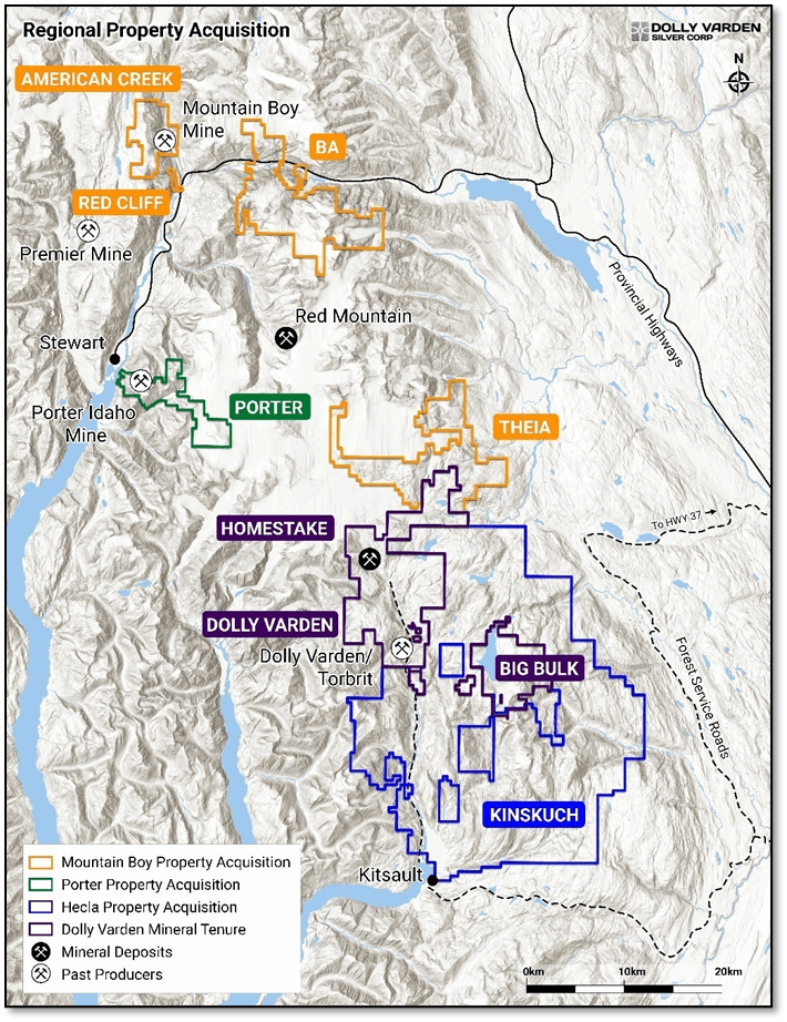 - Dolly Varden Silver quadrupled tenure area through acquisition of Hecla's 77,000-hectare Kinskuch Property for $5 million in shares, creating district-scale land position