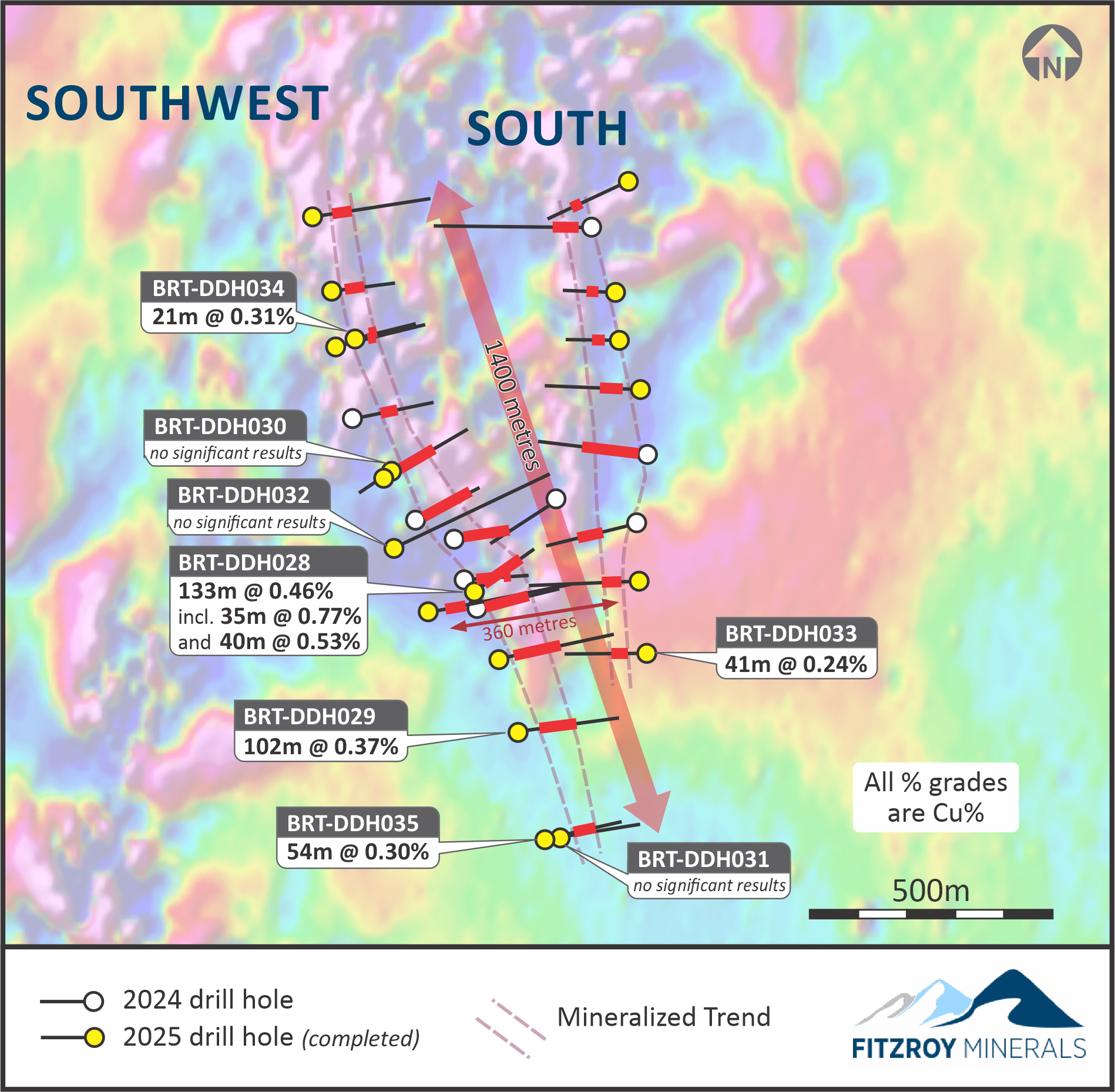 Fitzroy's October 2025 news release confirmed significant progress at both projects through Phase 2 drilling programs. At Buen Retiro, an 8,000-meter program focused 85% on shallow oxide targets and 15% on deeper sulphide potential, with step-out holes extending the oxide envelope and infill drilling improving continuity confidence. Geophysical surveys identified deep magnetic anomalies consistent with Candelaria-style IOCG systems, suggesting substantial exploration upside beneath the known oxide resource.