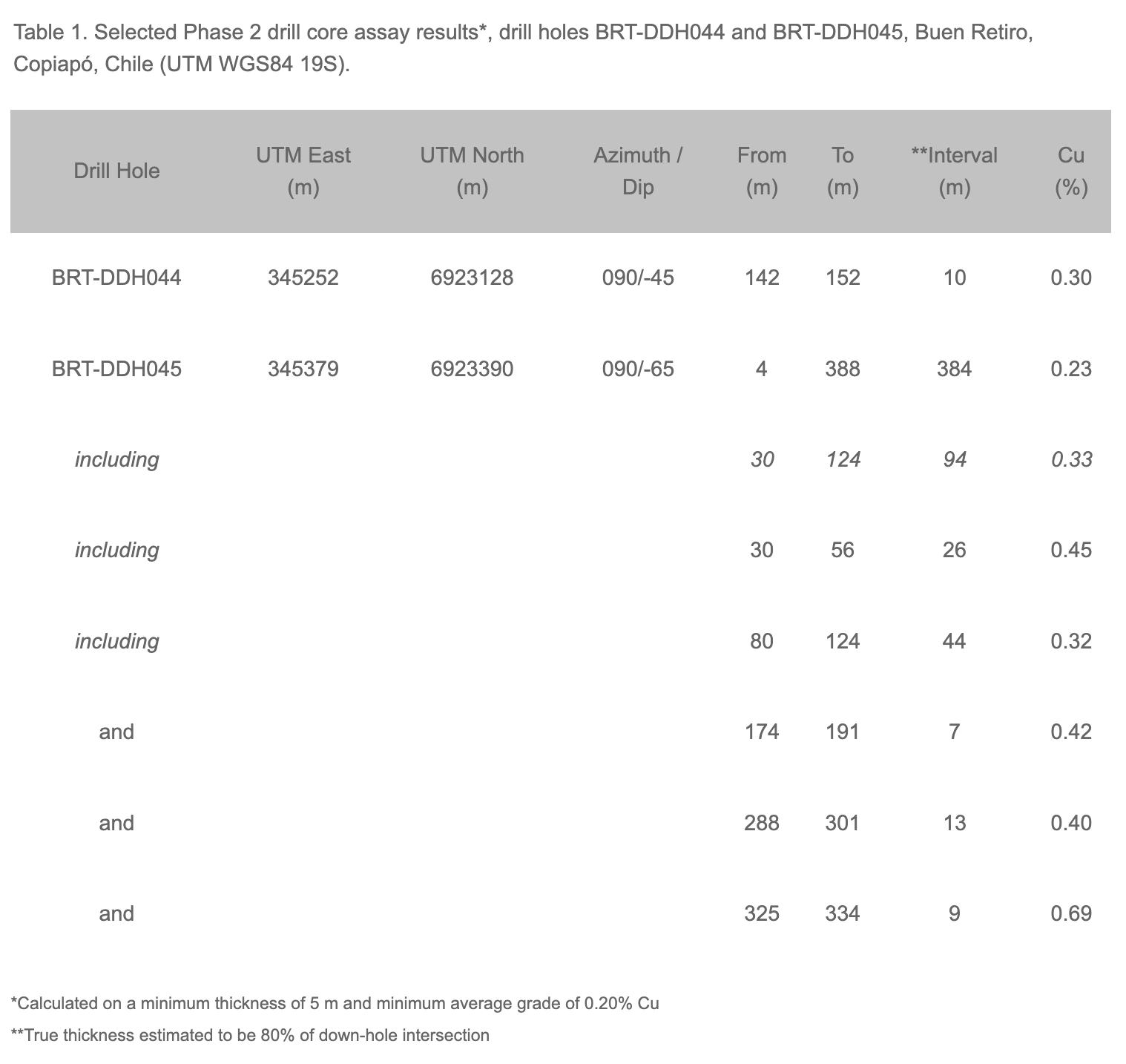 - Fitzroy Minerals has reported a drill hole intersecting 384 metres grading 0.23% copper from 4 metres depth, including 94 metres at 0.33% copper from 30 metres, at the Buen Retiro copper project in northern Chile.