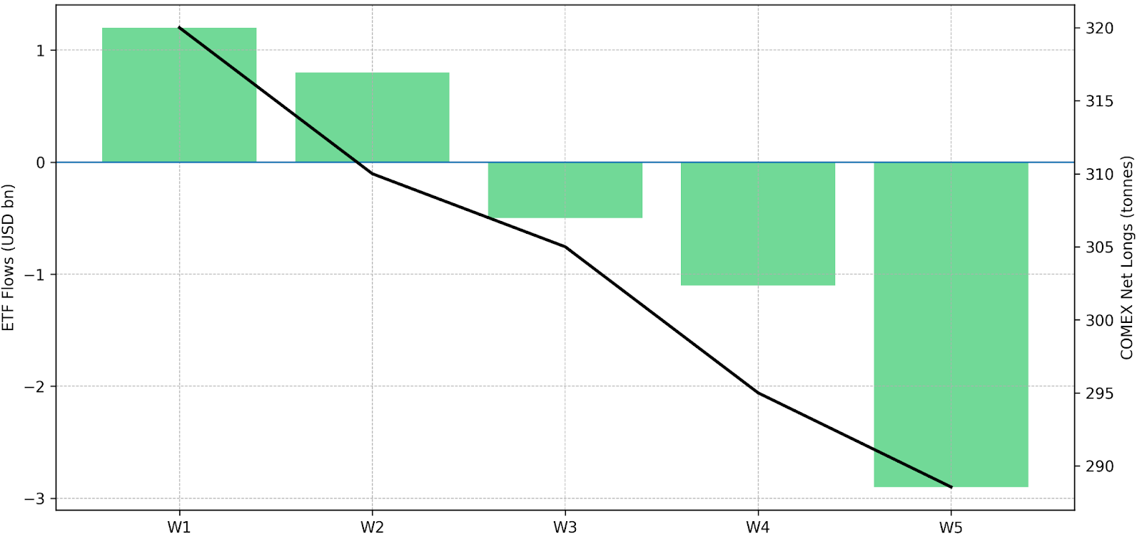 - North American and European gold ETF outflows exceeded US$2.9 billion in the week ending March 27, 2026; COMEX money manager net longs stood at 288.56 tonnes as of March 24, consistent with de-risking rather than bearish conviction.