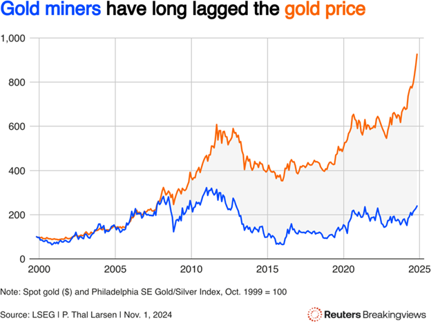 - Reuters (November 2024). Gold price surge adds glitter to tarnished miners