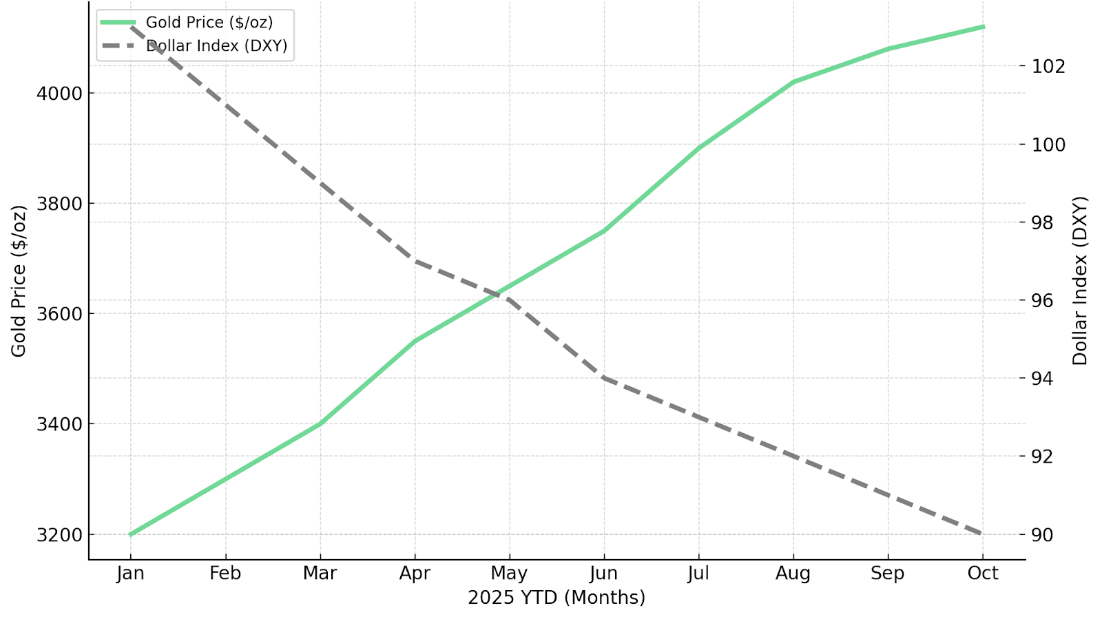 Gold's ascent is closely tied to expectations of further Federal Reserve interest rate cuts. The market has priced two additional rate reductions for 2025, driven by the Fed's easing bias and concerns about economic deceleration. Lower rates decrease the opportunity cost of holding non-yielding assets like gold, particularly as real yields have fallen sharply. The dollar index has declined 10% year-to-date, marking its steepest fall since the 1970s and making gold cheaper for international buyers.