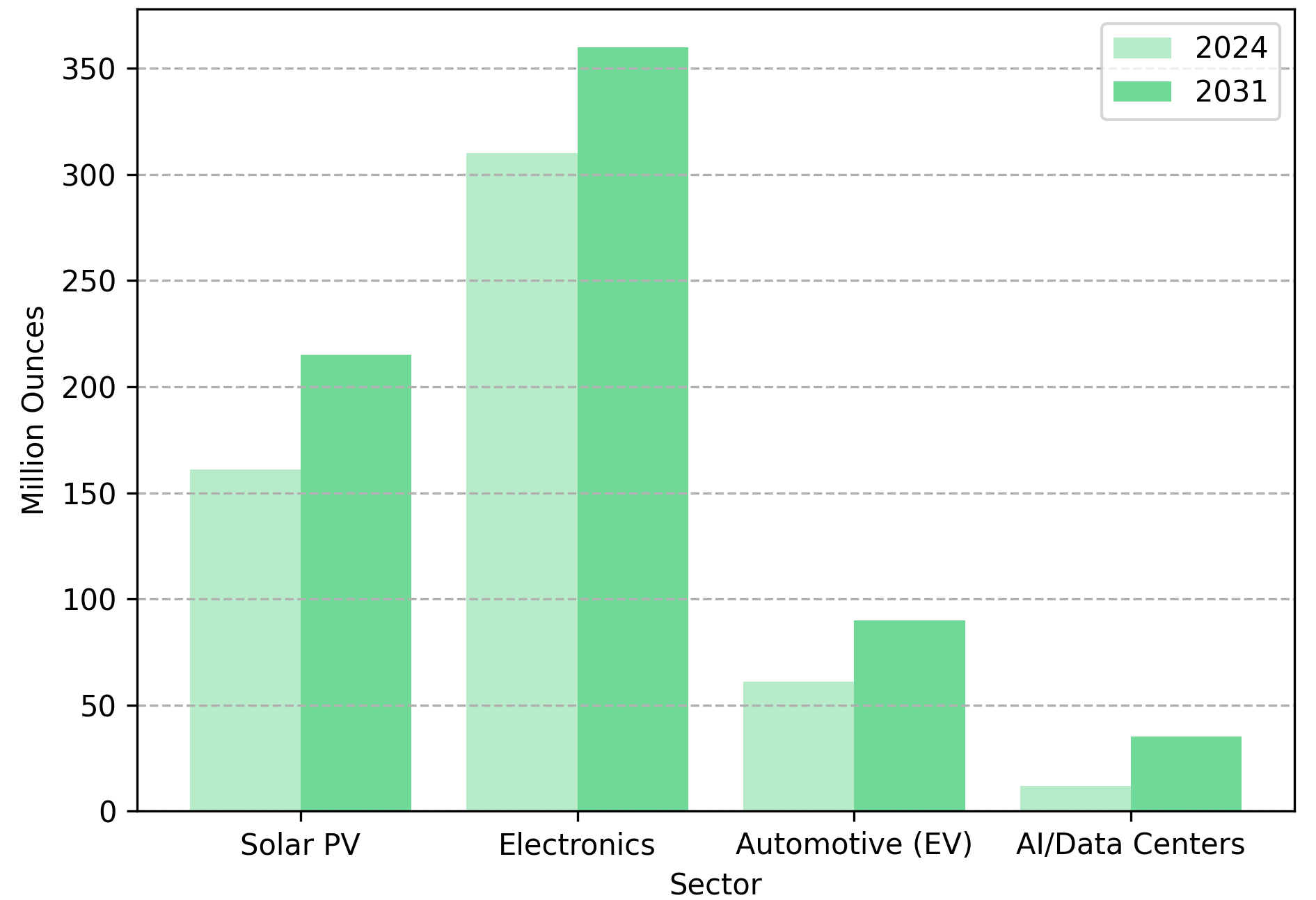 The automotive sector represents a parallel and well-documented demand driver. Electric vehicles require significantly more silver per unit than internal combustion engine vehicles, due to silver's use in power electronics, battery management systems, and charging infrastructure. Industry forecasts suggest automotive silver demand could grow at a compound annual rate of 3.4% between 2025 and 2031, with electric vehicles projected to become the dominant source of automotive silver consumption by 2027, based on current adoption trajectories. Research into ultra-thin silver coatings for ceramic battery electrolytes represents an additional long-term demand pathway, though these applications remain at early stages of development as of 2025.