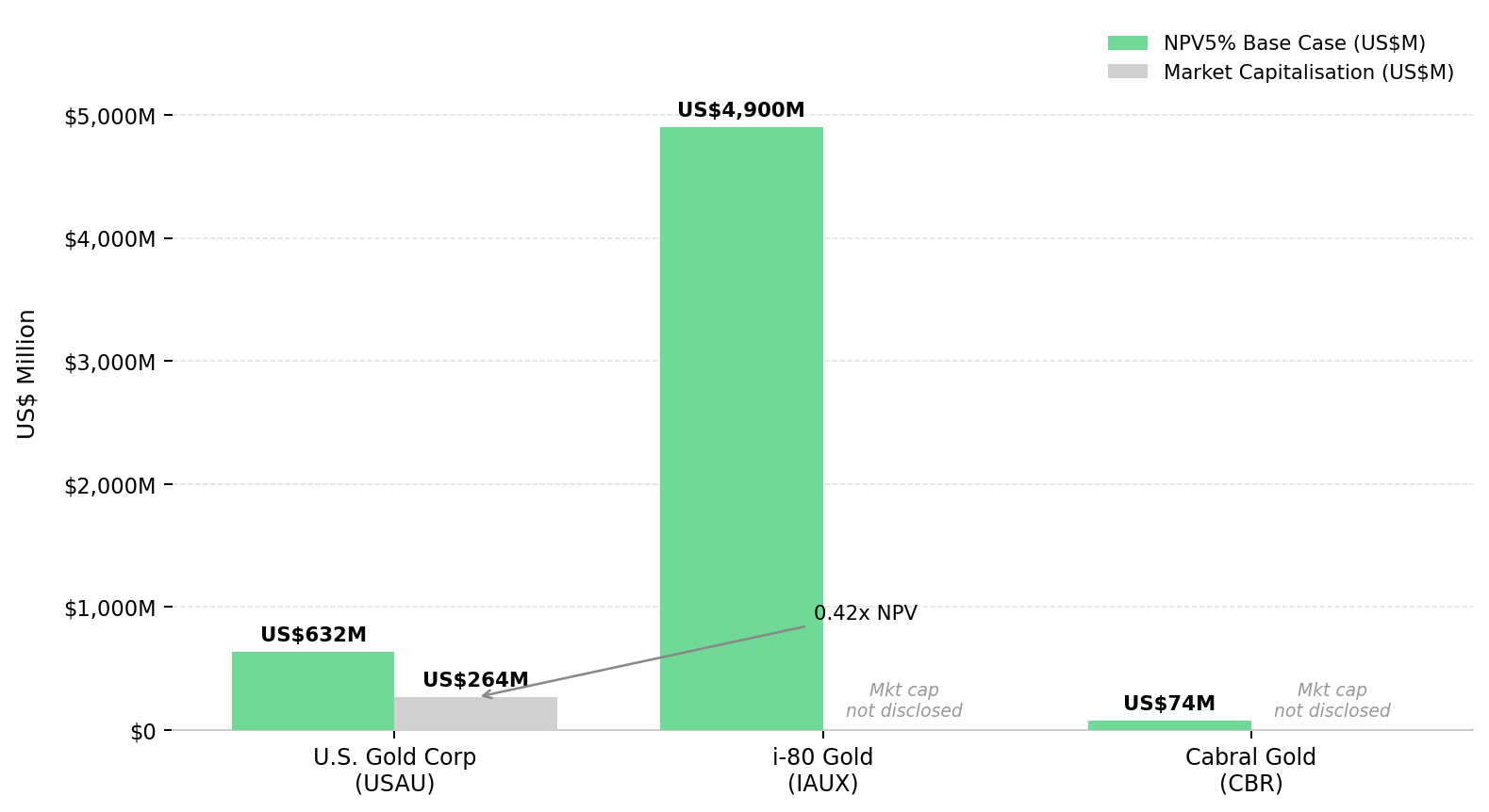 U.S. Gold Corp completed an April 2026 Definitive Feasibility Study for the fully permitted CK Gold project in Wyoming, definitively reporting an after-tax net present value of US$632 million, which geometrically rises to approximately US$1.4 billion at US$4,500 per ounce gold. The project strategically holds all required federal and state permits, which are fundamentally non-revocable under Wyoming state law.