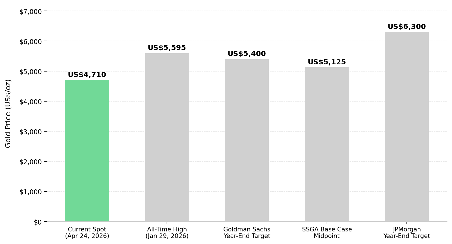 Gold closed April 24, 2026, at US$4,710 per ounce, representing a 15.9% contraction from the January 29 all-time high. The Strait of Hormuz is operating under a supervised pause, sustaining Brent crude at levels incompatible with the Federal Reserve achieving its 2% inflation mandate. Goldman Sachs Commodities Research warned that if the Strait remains restricted, Brent crude will average above US$100 per barrel throughout 2026, anchoring headline inflation and elevating real yields.