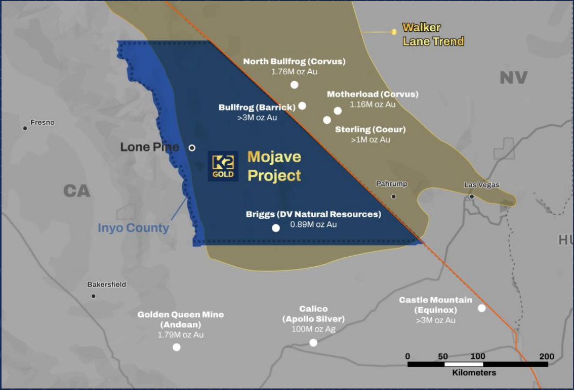 K2 Gold's Mojave Project sits in Inyo County, California with an exploration history at Mojave dates to 2020, when its first drill programme returned results including a highlight intercept of 86.9 metres at 4 g/t gold from the Dragonfly target, with mineralisation beginning at surface in all-oxide material.