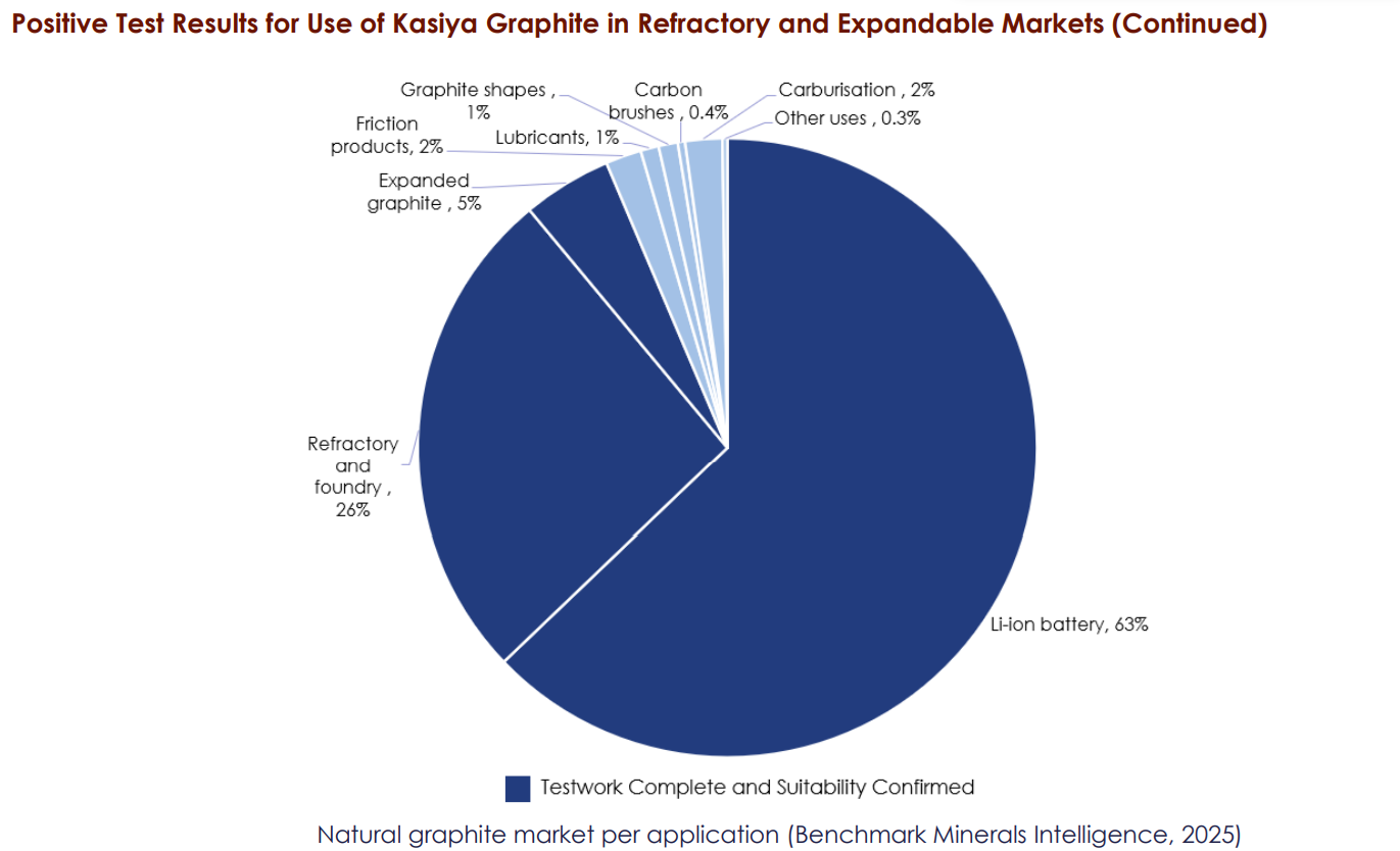 The latest testwork confirms that Kasiya's graphite is suitable for use in the three key segments that account for over 94% of the ~1.6Mtpa global demand for natural flake graphite - battery anodes, refractories, and expanded/expandables.