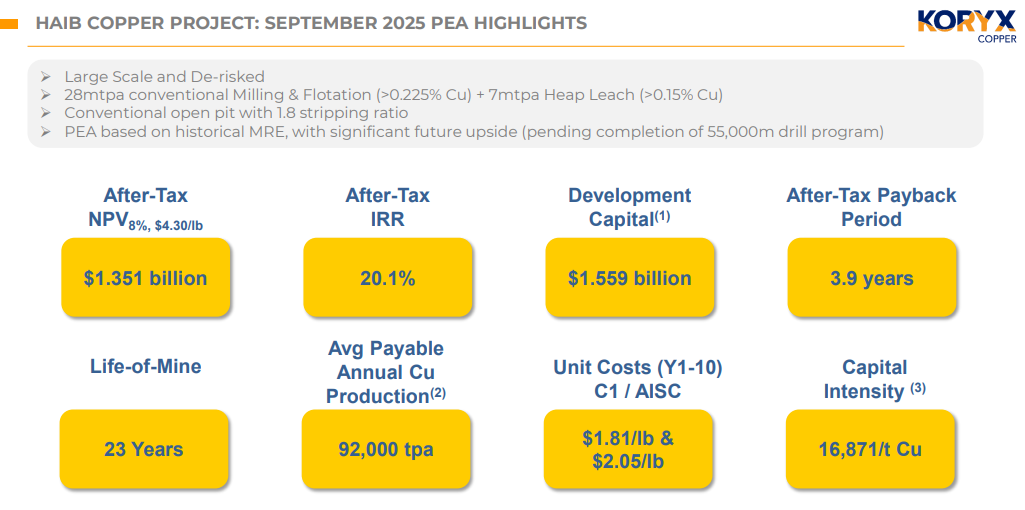 Koryx's stated strategy is to advance Haib to an investment decision on a standalone basis, at which point a joint venture, acquisition, or other strategic structure becomes the most logical path forward. Daun was direct: the project's likely $1.5 to $2 billion capital requirement is too large for a junior to finance and construct independently.