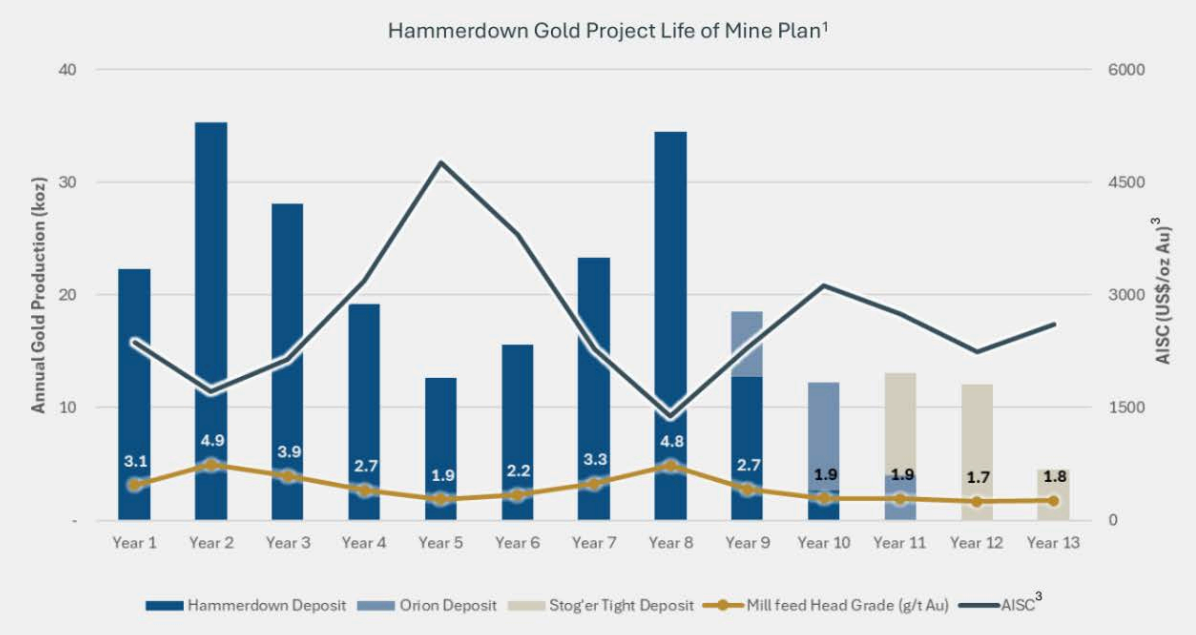 Hammerdown is operational and trucking ore to Pine Cove Mill as it ramps toward commercial production. A PEA on the combined Hammerdown and Pine Cove properties projected approximately 50,000 ounces over the next two years, with modelled cash flow upwards of C$100 million at a US$4,000 per ounce gold price assumption.