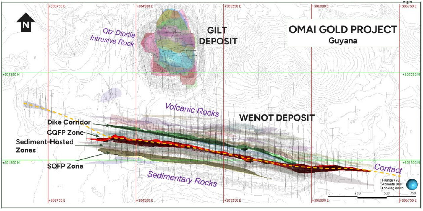 The Omai project comprises two distinct deposits with complementary characteristics. Wenot, the larger open-pit deposit, extends 2.5 kilometers along strike and has been defined to 500 meters depth. It consists of multiple vertical zones that appear likely to form a single large pit based on preliminary constraining pit analysis. The Gilt Creek deposit, located 450 meters from Wenot, is a cylindrical intrusive body containing approximately 2.5 million ounces at a higher average grade of 3.33 g/t across 25 separate zones, making it suitable for underground mining.