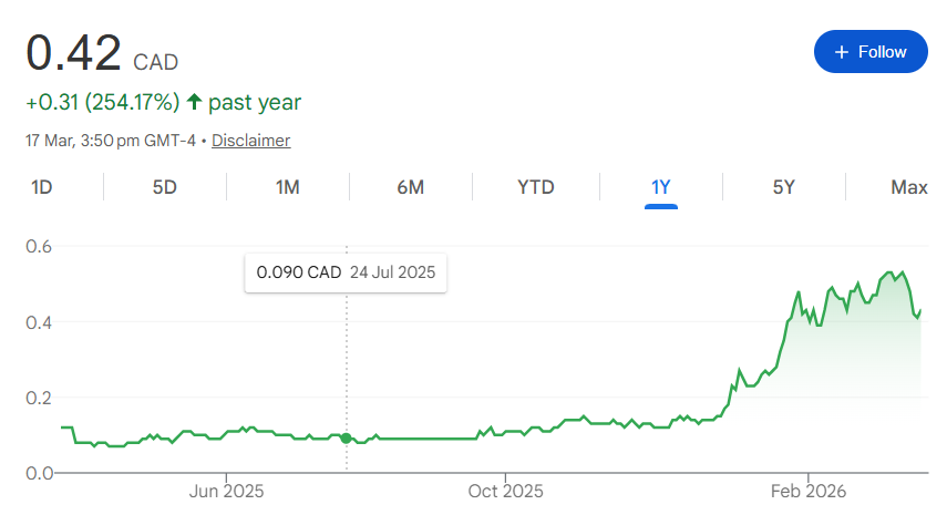 Precipitate's own stock has followed a similar trajectory. Shares have appreciated more than 250% over the past year, moving from around $0.09 in mid-2025 to $0.42 currently, supported by the financing, advancing exploration work, and improving jurisdictional sentiment.