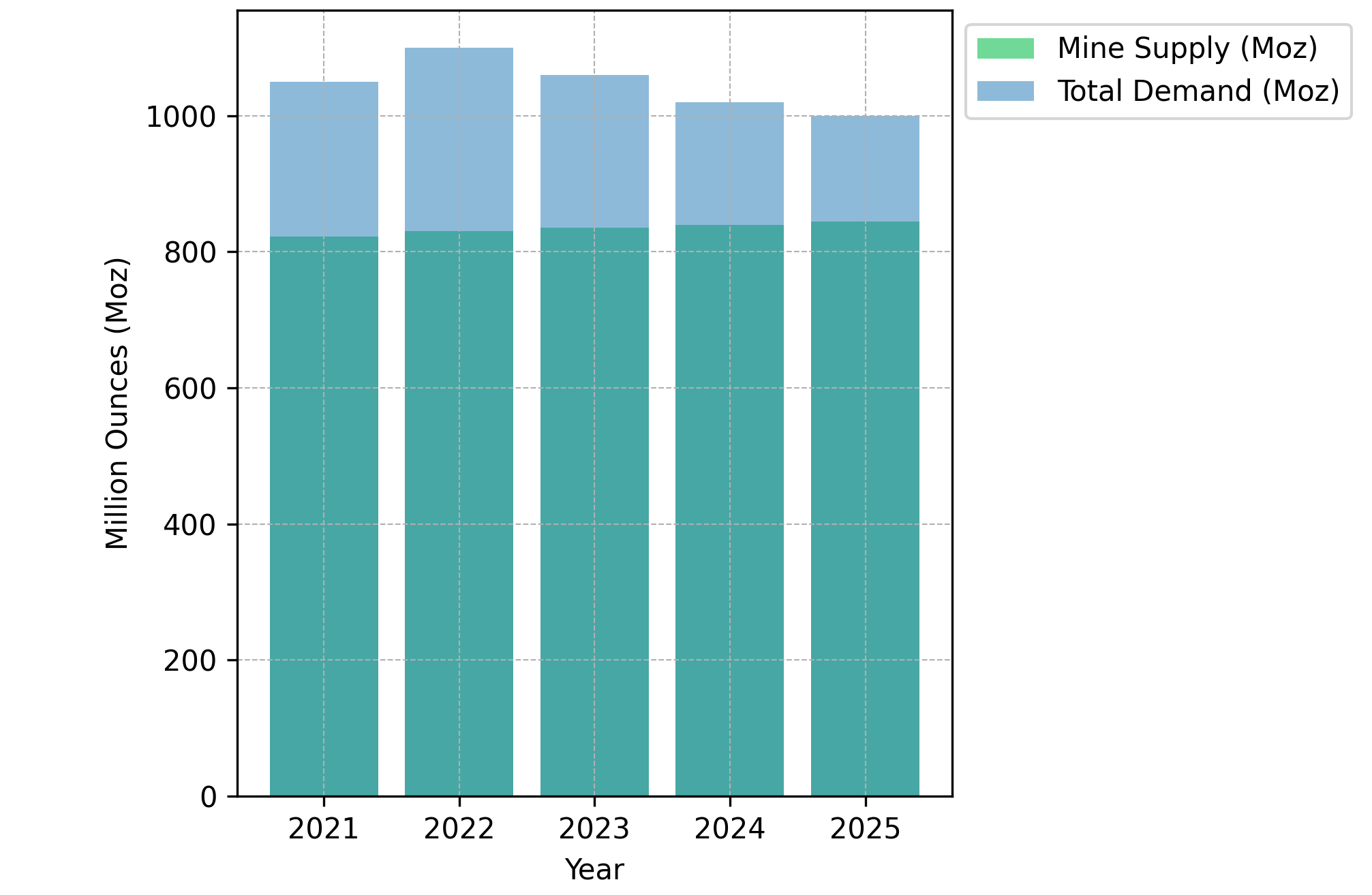 - Since 2021, the global silver market has recorded annual shortfalls ranging from 100 million to 250 million ounces against total mine supply of roughly 800 to 850 million ounces per year