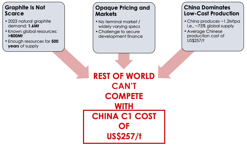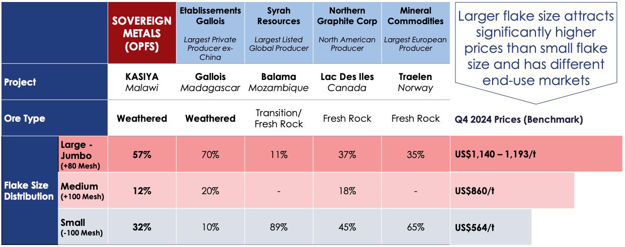 Graphite introduces an additional layer of complexity. Kasiya's flake-size distribution, with 57% in the large-to-jumbo category, positions its concentrate toward the refractory, expanded graphite, and expandable graphite markets rather than the battery anode market. Large- to jumbo-flake graphite achieved benchmark prices of US$1,140 to US$1,193 per tonne in the fourth quarter of 2024, compared with US$564 per tonne for small-flake battery anode material. That pricing differential is commercially meaningful, but the refractory and expanded graphite markets together represent approximately 31% of global natural graphite demand by volume. Placing approximately 265,000 tonnes per year into those segments requires Kasiya to capture a substantial share of existing market demand, not simply supply a growing demand pool. The incremental graphite production cost of US$241 per tonne sits below China's weighted average of approximately US$257 per tonne.