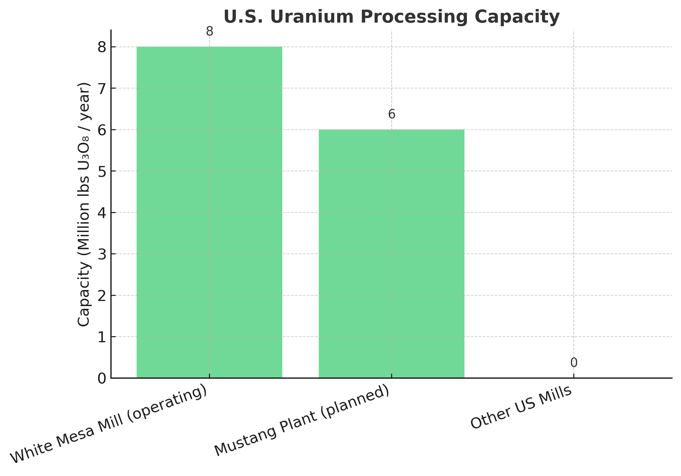Perhaps nowhere is the supply constraint more evident than in uranium processing infrastructure. The United States currently operates only one conventional uranium mill, the White Mesa facility in Utah which has become a critical chokepoint in the domestic uranium supply chain. This facility, licensed to process over 8 million pounds of U₃O₈ annually, serves not only as a uranium processor but also as the only U.S. facility capable of processing monazite into rare earth element oxides.