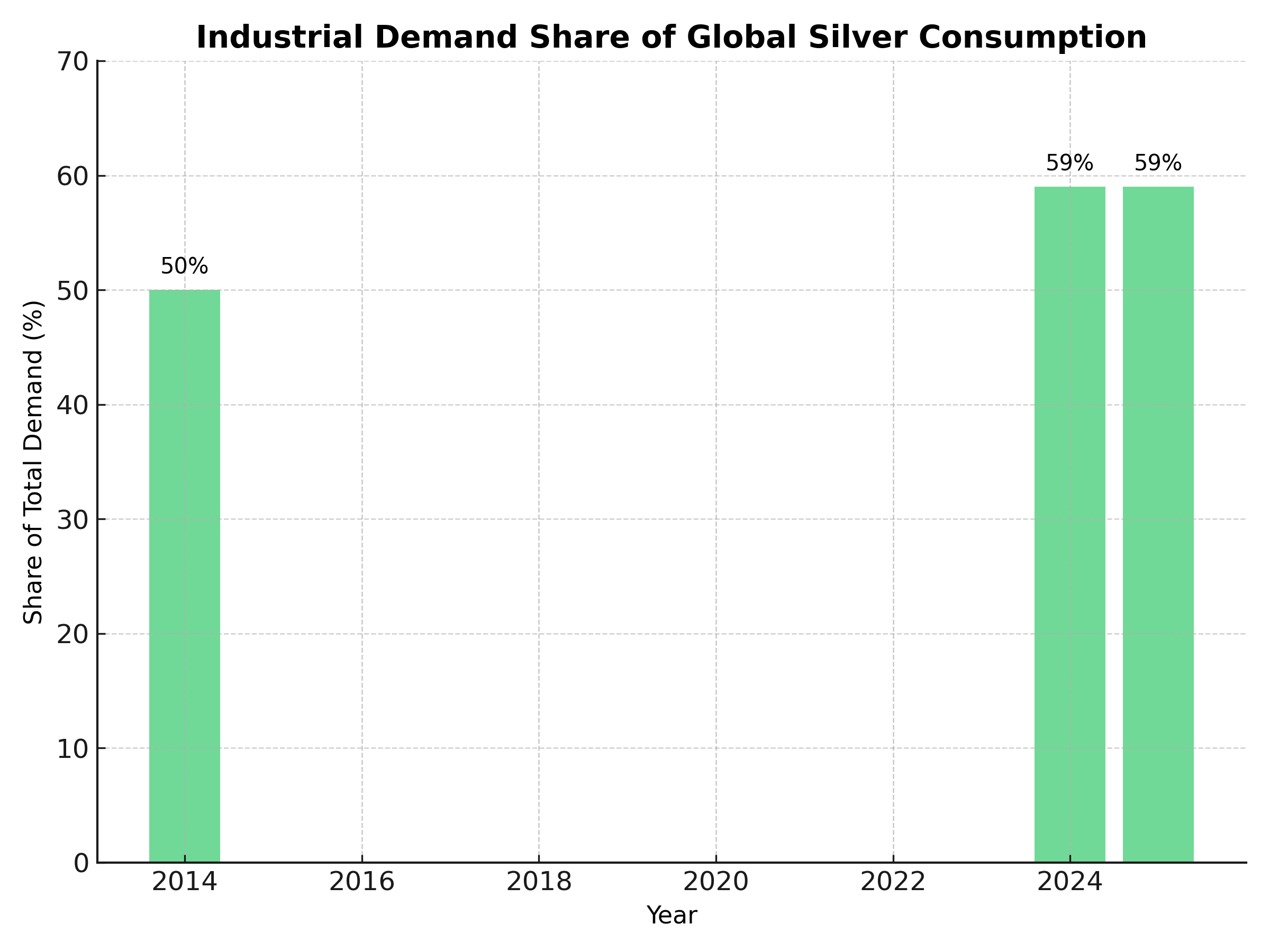 - The silver market has recorded its fourth consecutive year of supply deficit, with industrial demand now representing 59% of total consumption—up from 50% just a decade ago, creating unprecedented market tightness.