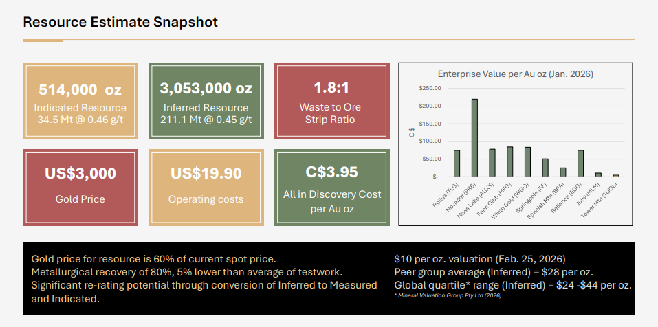 The 2026 work program front-loads 7,500 metres of infill drilling in Q1, followed by another 7,500 metres in Q2, alongside metallurgical testwork and environmental baseline studies. The goal is a Q4 resource update and PEA, giving the market its first look at project-level economics.