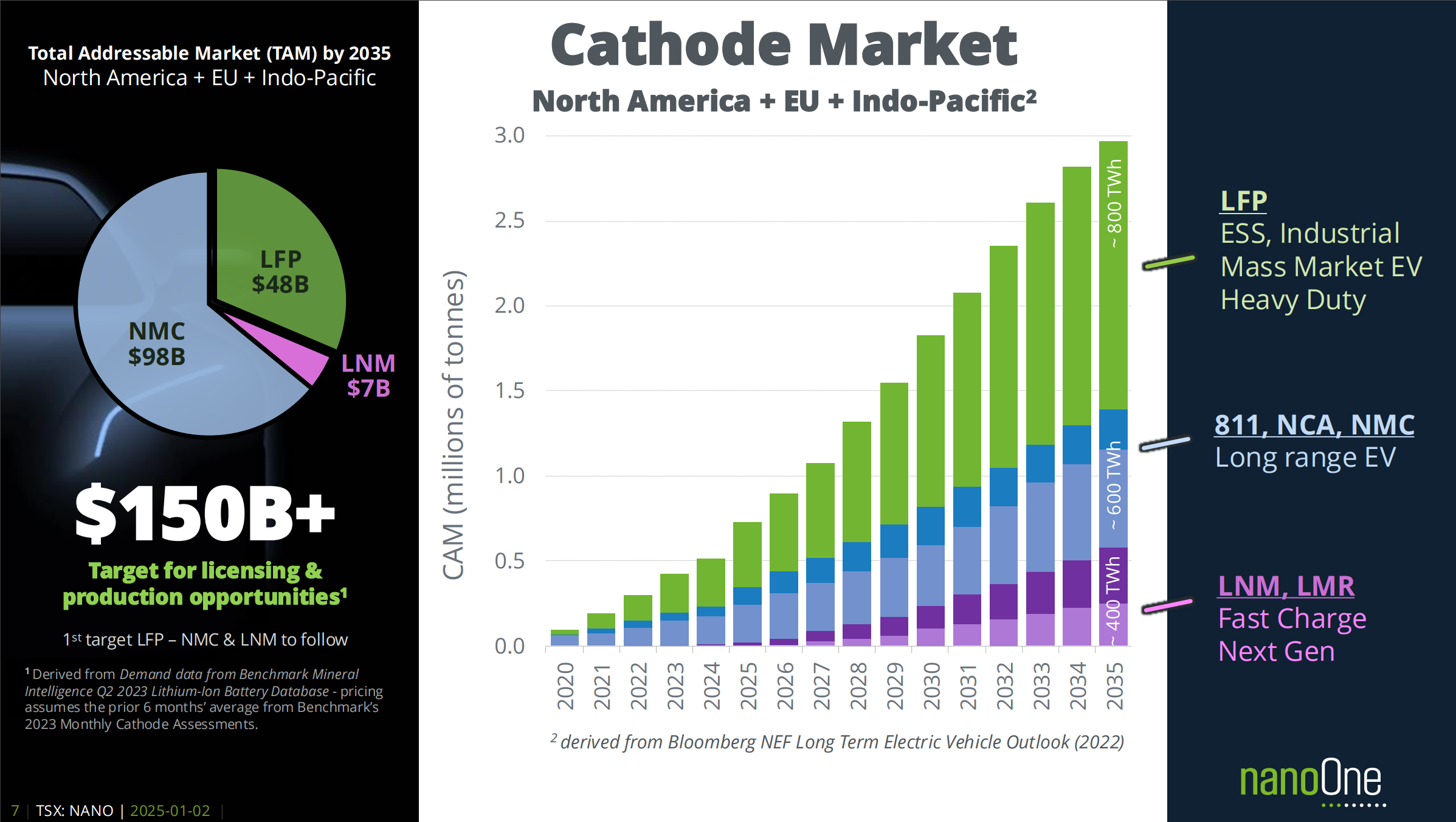 Led by CEO Dan Blondal, the company has assembled a leadership team with over 500 years of combined cathode experience and cultivated strategic partnerships with industry leaders including Rio Tinto, Sumitomo, Worley, BASF, and Volkswagen. Nano One has received significant government support, including C$18M from Quebec and US$12.9M from the U.S. Department of Defense in 2024 alone, reflecting its strategic importance in establishing Western battery material production capabilities. Operating a flexible business model spanning licensing, independent manufacturing, and joint ventures, the company targets a $150B+ market opportunity by 2035 across North America, EU, and Indo-Pacific regions, with particular strength in the rapidly growing LFP segment that now commands 60-70% market share in China and is expanding globally as the EV market transitions toward mass adoption.