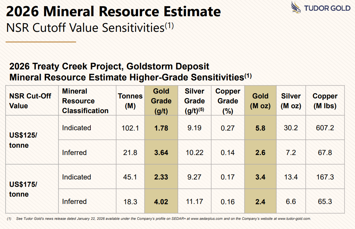 - Tudor Gold's Treaty Creek project contains 24.9 million ounces of indicated gold and 4 million ounces of inferred gold, representing one of the largest undeveloped gold deposits globally with higher-grade zones suitable for underground mining.
