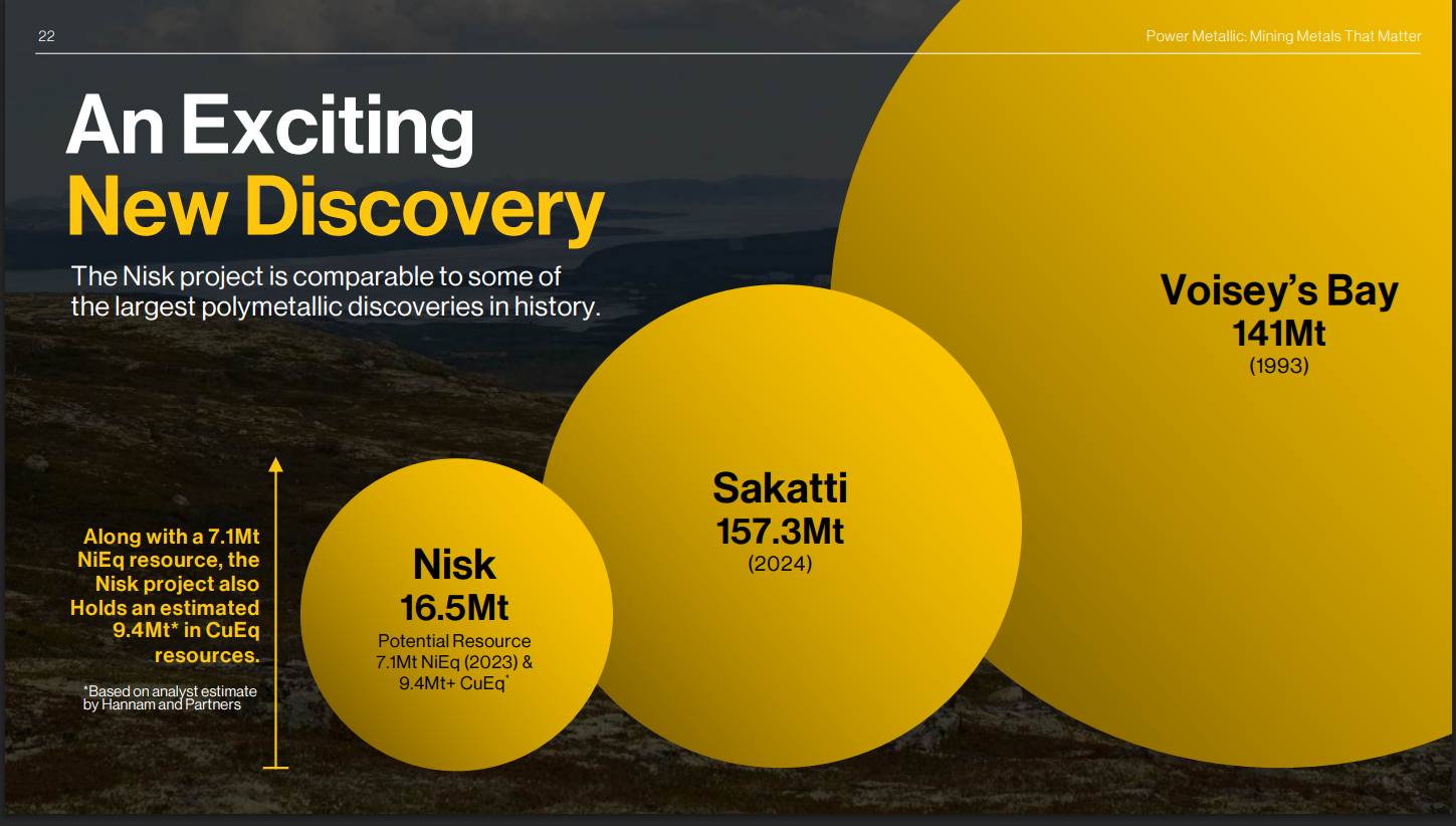 - Power Metallic' NISK project in Quebec is described as the world's highest-grade copper-PGE discovery, with 95+ intersections averaging over 11 meters at 4.25% copper equivalent, including holes hitting 22 meters at 10.99% copper equivalent