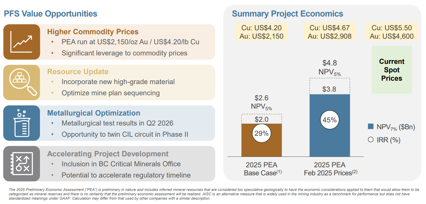 The company's February 2025 PEA demonstrated $5 billion in after-tax NPV using $2,900 gold and $4.60 copper prices to which at the time that were lower than long-term analyst consensus. Current pricings stands substantially higher than the PEA assumptions and suggesting significant upside to the published economics.