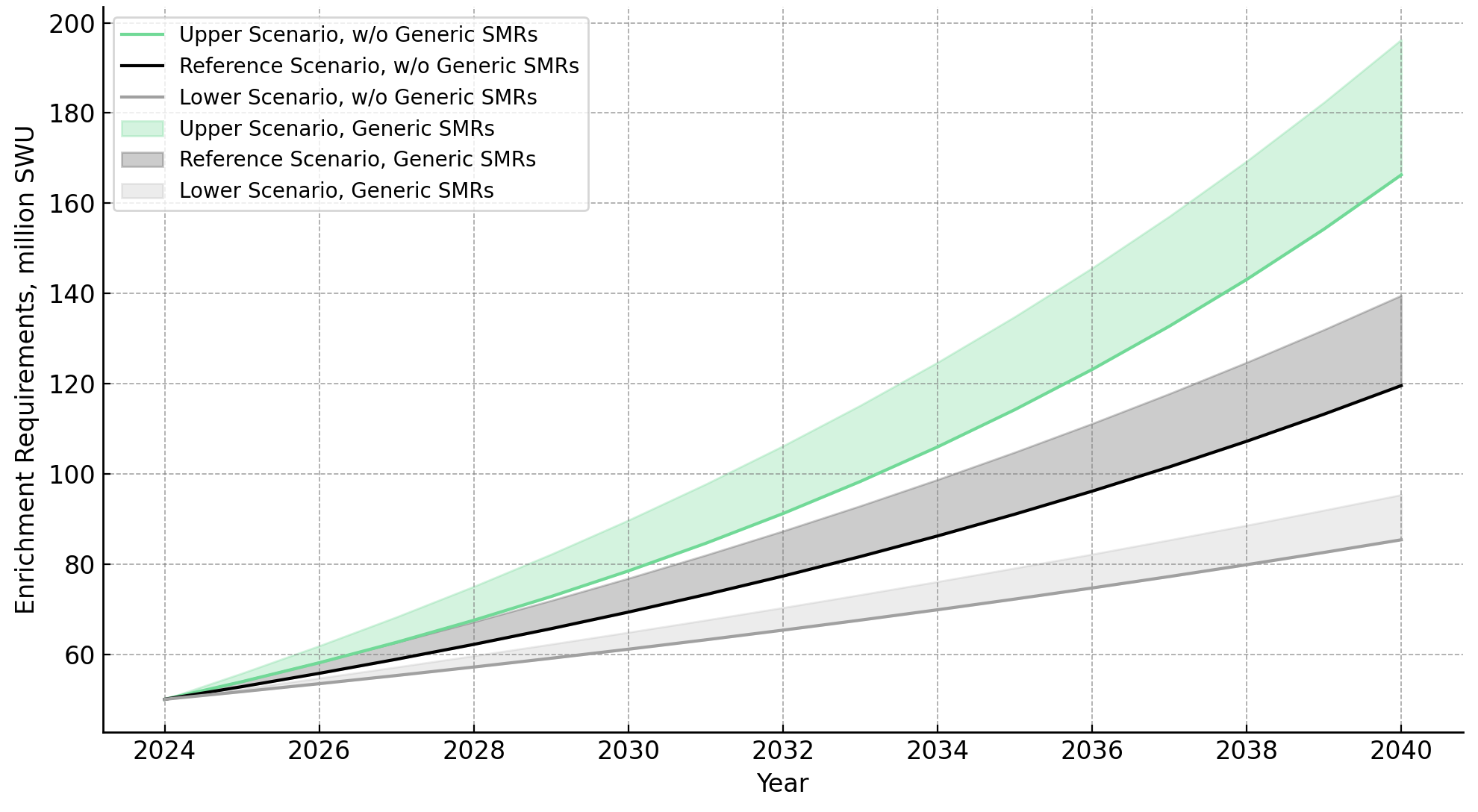 Under the Reference Scenario, generic Small Modular Reactor deployment is expected to require approximately 3.7 million Separative Work Units per year by 2035–2040. This represents a notable deployment pace, with Small Modular Reactor demand commencing by the end of the current decade and increasing annually at a moderate pace. By the end of the next decade, Small Modular Reactors could account for over 10% of global enrichment requirements.