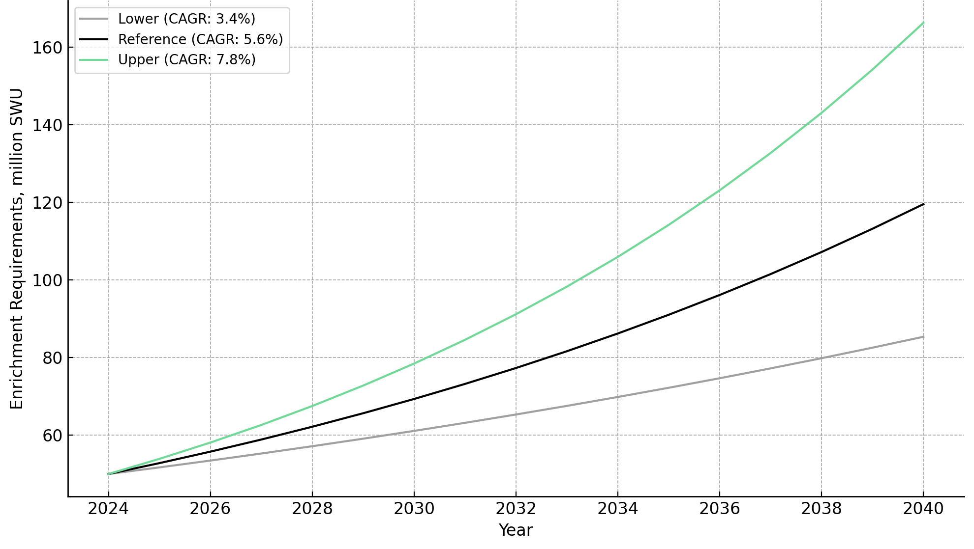 - Global enrichment demand is growing at a 5.6–7.8% compound annual growth rate through 2040, outpacing installed capacity and signaling a post-2034 supply deficit under the Upper Scenario.