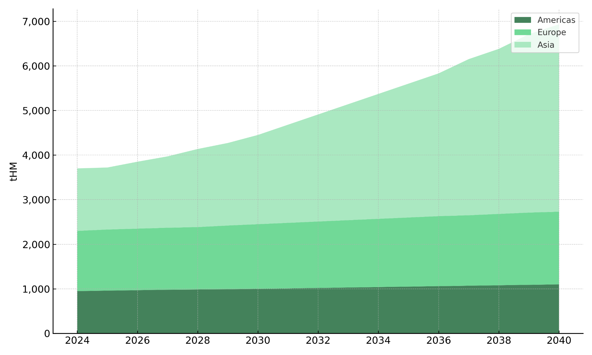 The demand profile consists of first cores, three times larger than reload batches, and steady reload demand, creating temporary surges tied to reactor commissioning timelines. The IAEA Reference Scenario projects nearly 3,000 tonnes of heavy metal per year for first cores by the end of the projection period. Asia accounts for the majority of growth, underscoring how front-end uranium supply and downstream fabrication capacity must remain aligned.