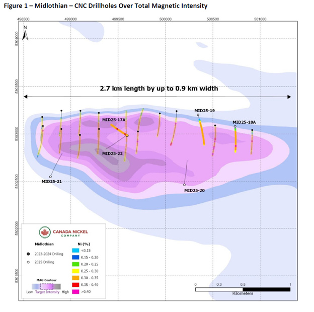 Recent drilling at Midlothian confirms the "Three Giants" thesis of multiple Crawford-scale deposits within the district. September 2025 results included 330 meters at 0.30% nickel, 449 meters at 0.29% nickel including 10.5 meters at 0.36%, and 379 meters at 0.29% nickel. All six holes from the 2025 program intersected broad, continuous mineralized dunite zones. An initial Midlothian resource estimate is scheduled for year-end 2025, with the deposit showing potential to match Crawford's resource base. The Mann West discovery adds a third major target, with intercepts of 0.63% nickel over 4.5 meters within 452 meters at 0.27% nickel. Additionally, the Bannockburn massive sulphide discovery yielded 3.95% nickel, 0.40% copper, 0.15% cobalt, and 1.08 grams per tonne platinum and palladium over 4 meters within 12 meters at 1.61% nickel, demonstrating the district's potential for higher-grade mineralization styles.